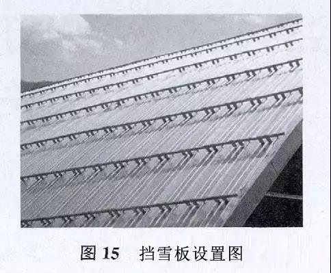 北方地區的屋面一般需要設置擋雪板。擋雪板材質一般為不銹鋼或鋁合金。擋雪板可根據屋面的基本雪壓和坡度來布置。天溝及檐口上方必須設置擋雪板,擋雪板的設置見圖15。